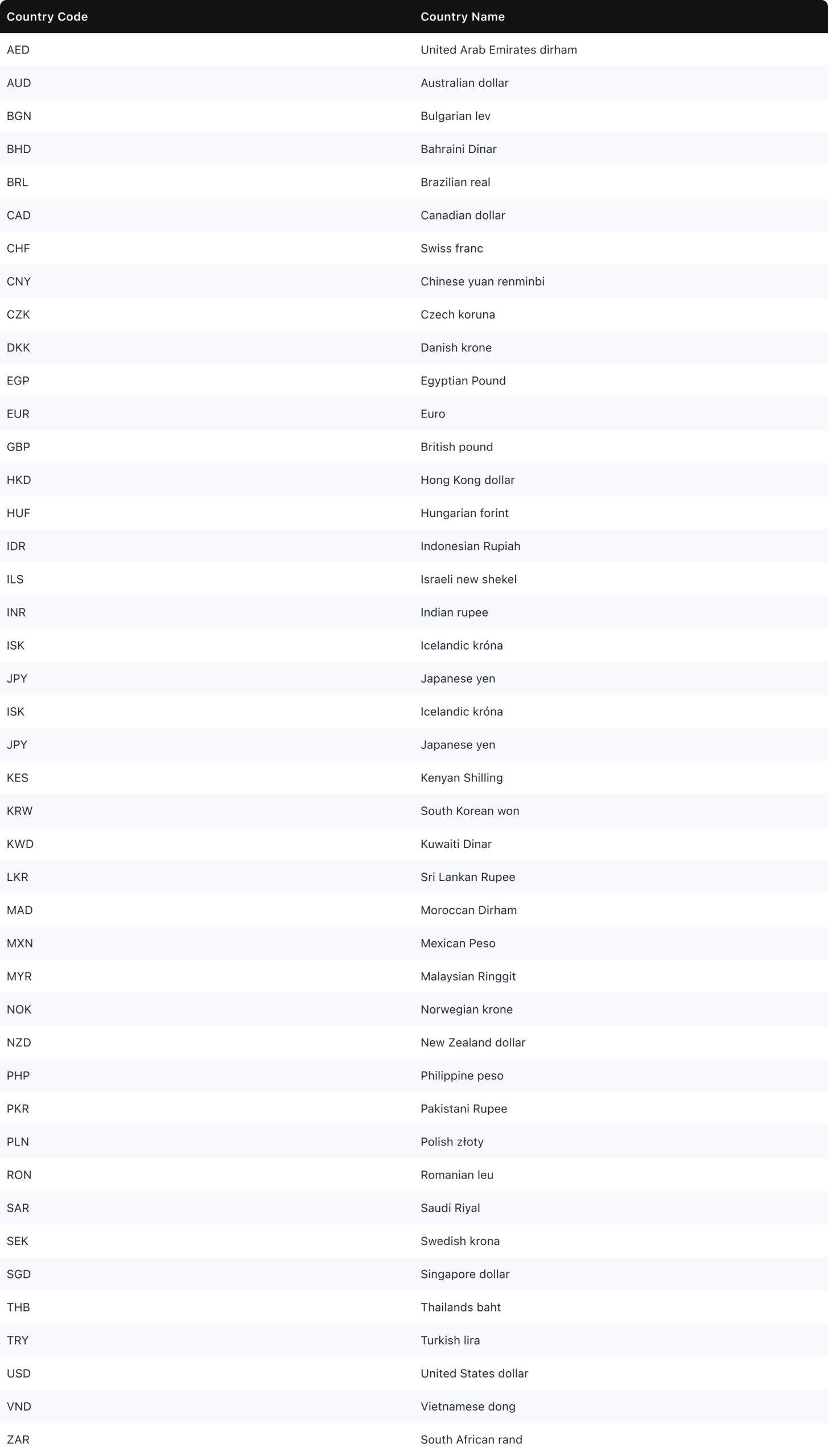 Supported currencies